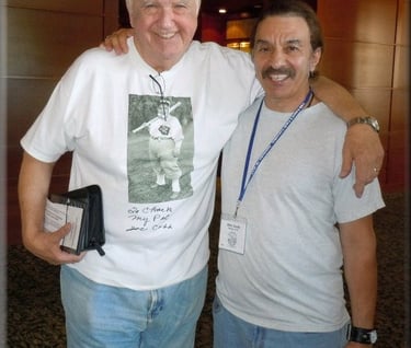 I met Chuck McCann in the hotel lobby. I introduced myself and went to shake his hand when suddenly our very own Steve Wichrowski walked right between us, and Chuck went "Whoa, what was that?" I told him about the interviews done on the NNNN Show from 1983 to 2009 and he said that was wonderful. I mentioned I had 2 cds containing many of the interviews for him. He said "These are for me? Oh, that's wonderful. Thank you so much - Here, I want to have my picture taken with you." I hadn't expected that as he was on a busy schedule but he put his arm around me and ordered Steve to take the photos. He told me that what we are doing with the interviews was great and that I should start my own tent. He talked about making sure that children got to see the Laurel and Hardy films and I told him I did that when teaching and still take out my projector and films occasionally for kids. As he walked off he said he was looking forward to hearing the interviews.