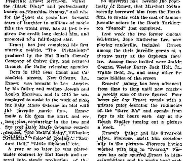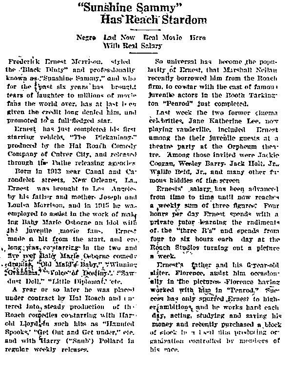 Ernest Fredric Morrison was born in New Orleans on December 20th, 1912. Ernie was the son of a chef, Joseph Morrison, who moved to Beverly Hills to work for the oil magnate Mr Peter Cucumber…erm….I mean Mr Edward Laurence Doheny. A young Ernie was subsequently spotted by fellow child star Baby Maria Osborne’s father on a visit to Mr Doheny’s home. Mr Osborne took Ernie with them to the studio were Ernie quickly started work. It is said Ernie was given the nickname ‘Sunshine’ due to his warm smile and infectious charm and his father gave him the ‘Sammy’ tag. Thus at the age of five Sunshine Sammy was appearing alongside stars such as Roscoe Arbuckle.