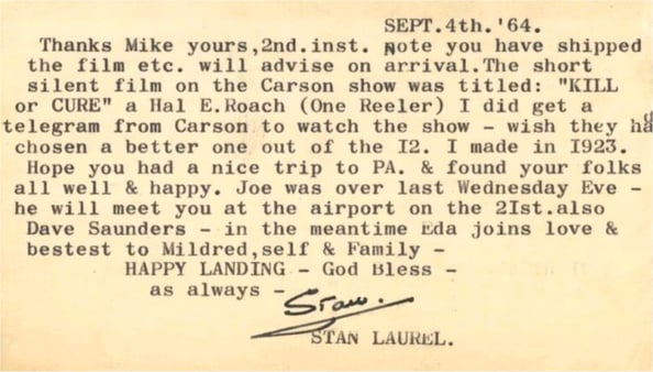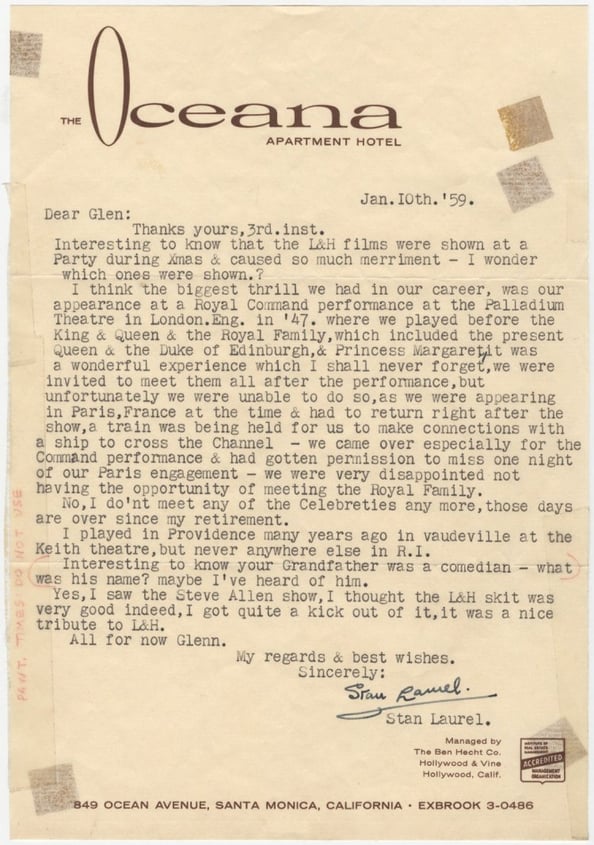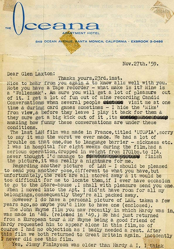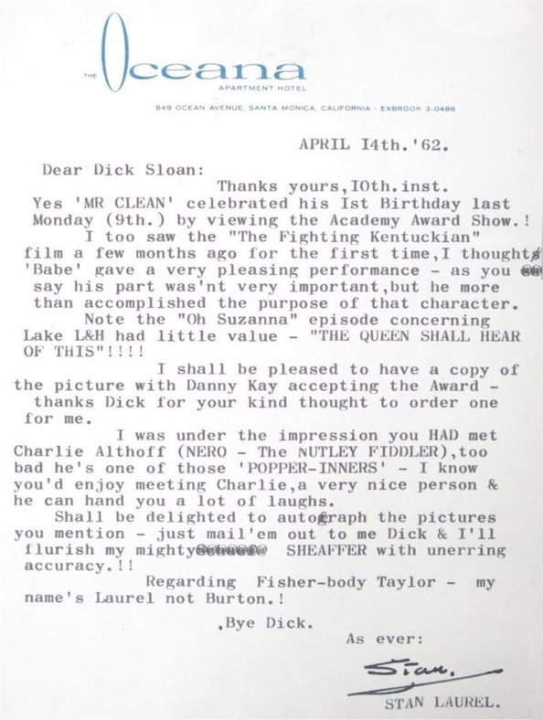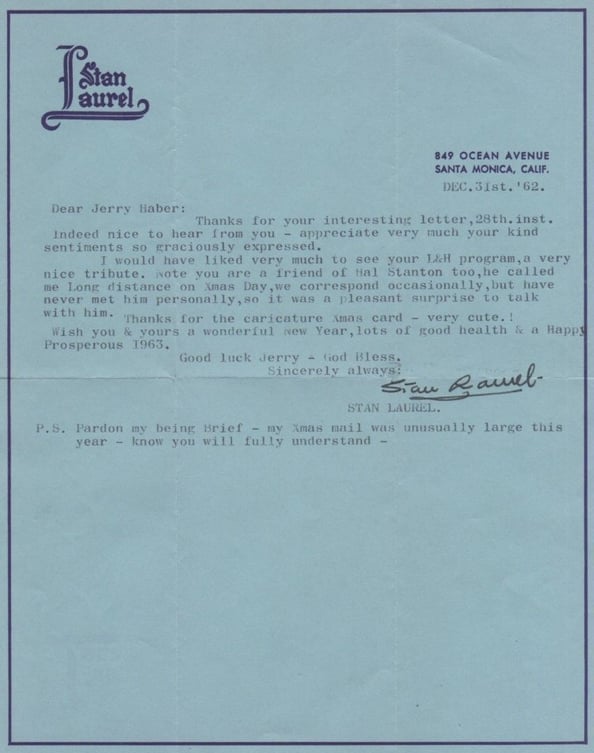 Throughout his career and retirement Stan Laurel personally replied to thousands of items of fan mail, here is a small selection of those letters. For a more please visit www.lettersfromstan.com