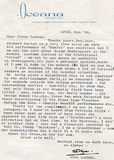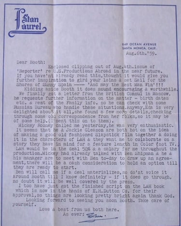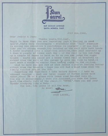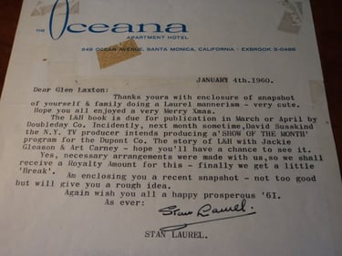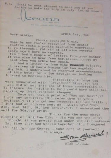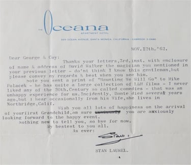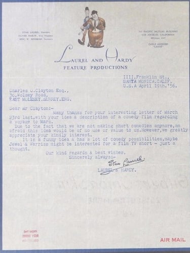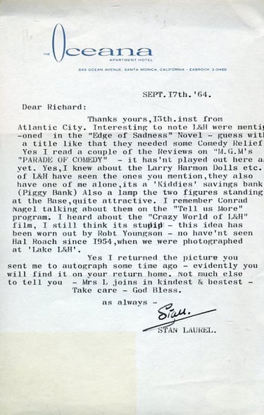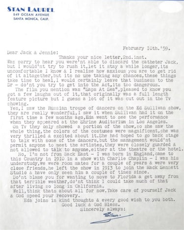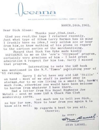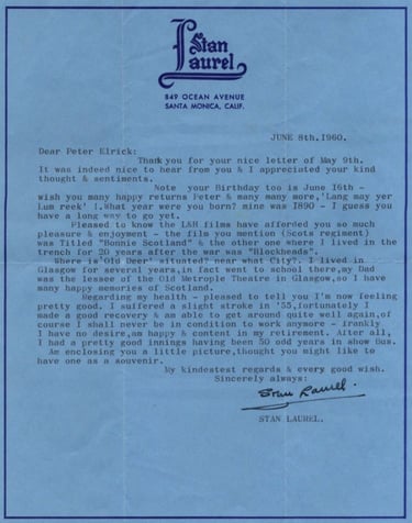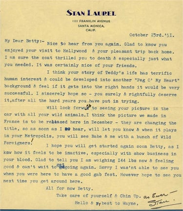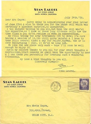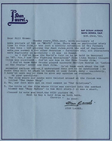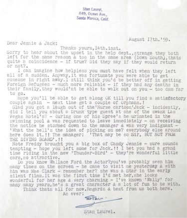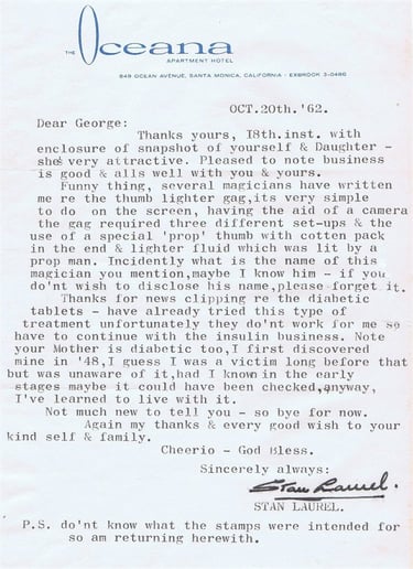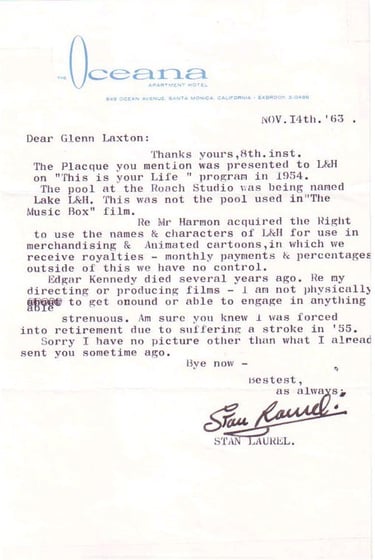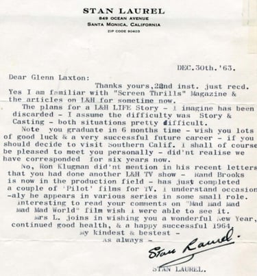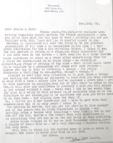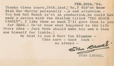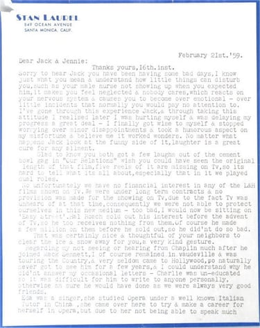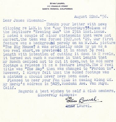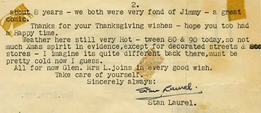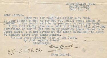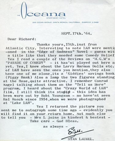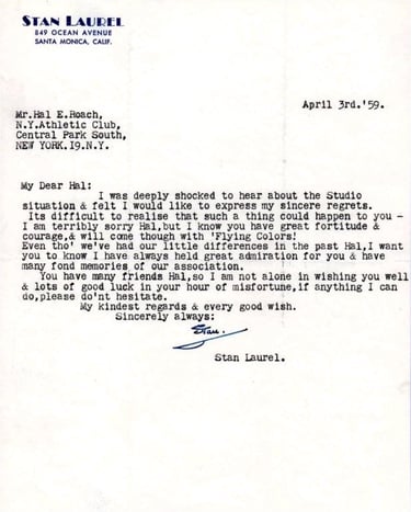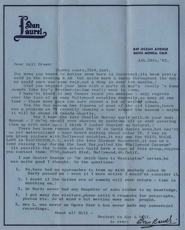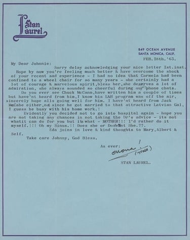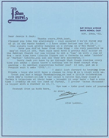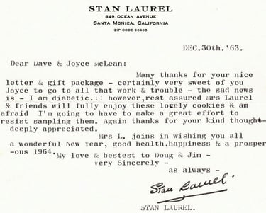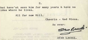 Throughout his career and retirement Stan Laurel personally replied to thousands of items of fan mail, here is a small selection of those letters. For a more please visit www.lettersfromstan.com