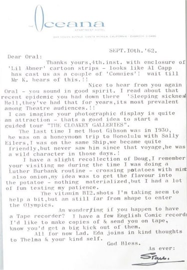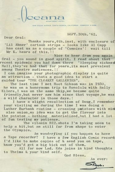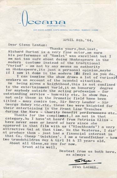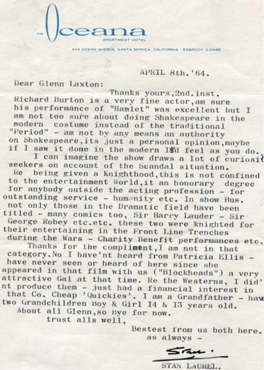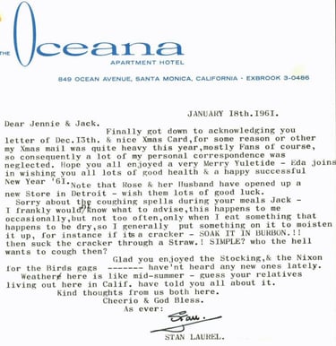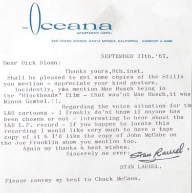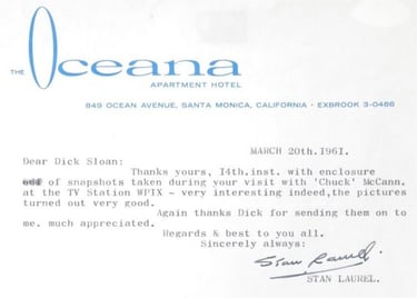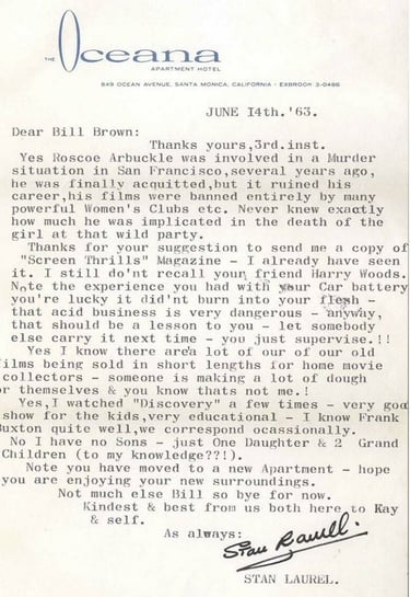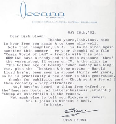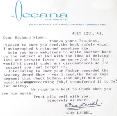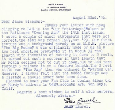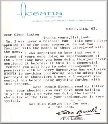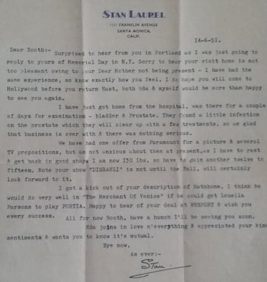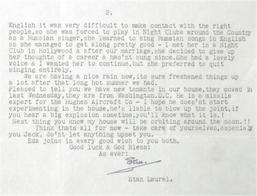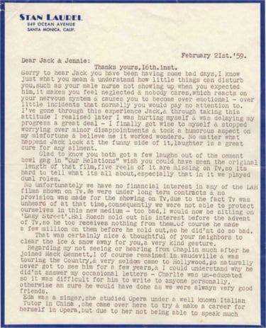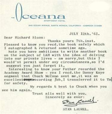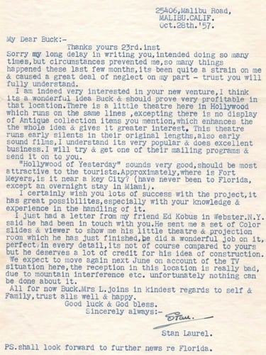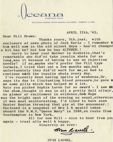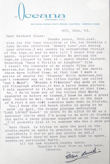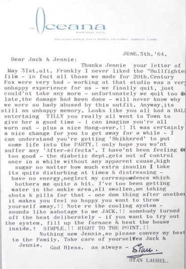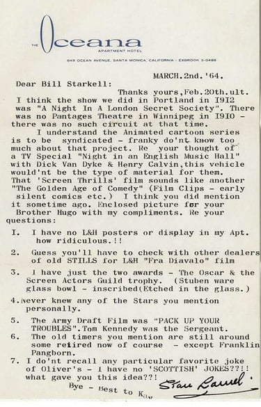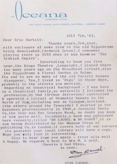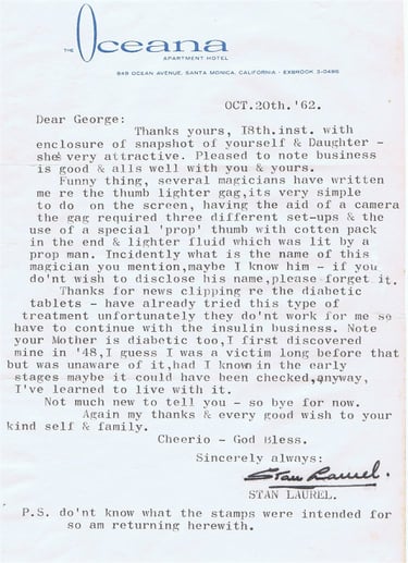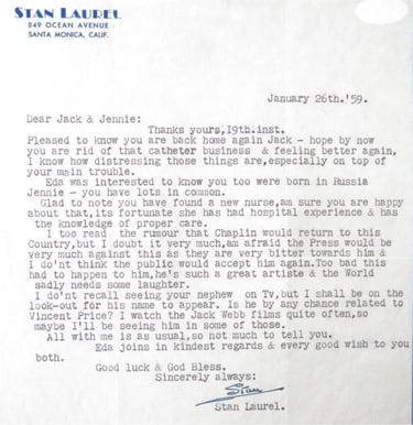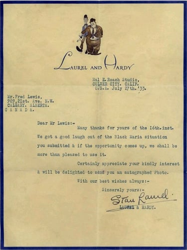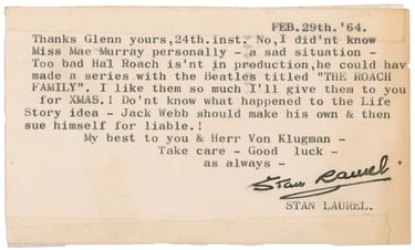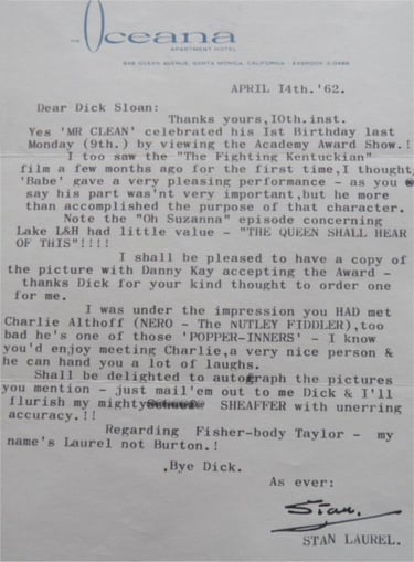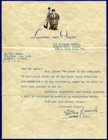 Throughout his career and retirement Stan Laurel personally replied to thousands of items of fan mail, here is a small selection of those letters. For a more please visit www.lettersfromstan.com